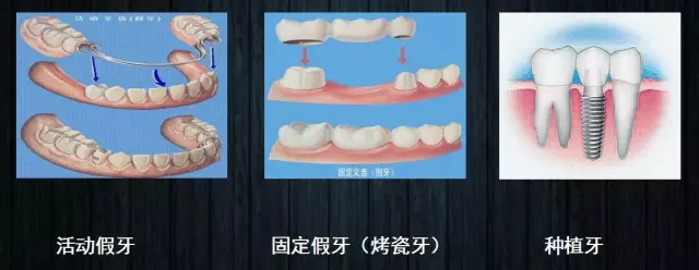 活动假牙、固定假牙(烤瓷牙)、种植牙。